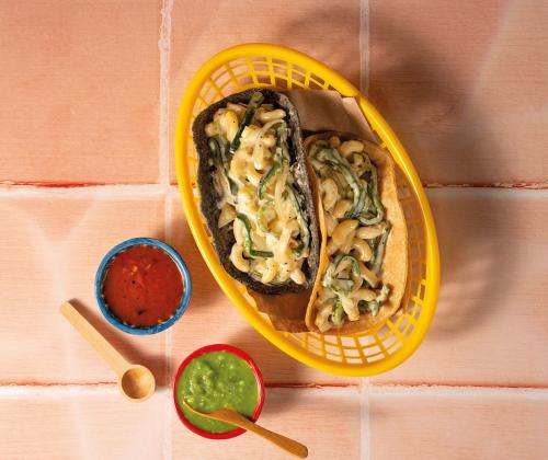 4. En una tortilla caliente, coloca una porción de cazón y añade el pico de gallo con pasta encima.