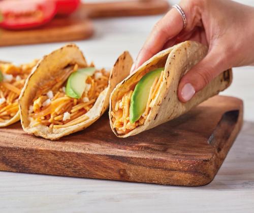 3. Calienta las tortillas de harina, unta guacamole y coloca el chicharrón y la pasta cocida. Decora con hojas de cilantro.