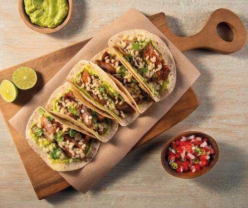 4. En una tortilla caliente, coloca el pescado empanizado, un poco de pasta cocida, una porción de ensalada de col y rebanadas de aguacate.
